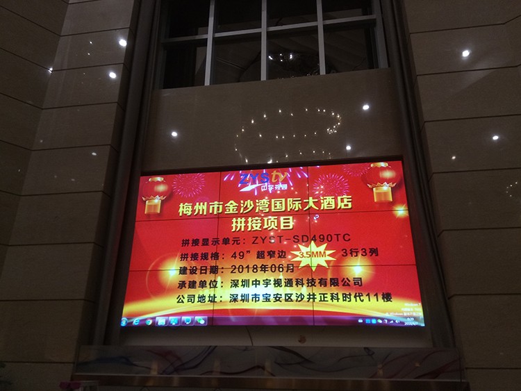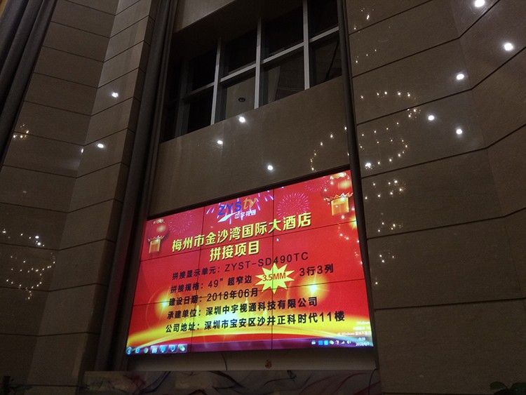 梅州市金沙灣國(guó)際大酒店選用中宇視通科技49寸3.5mm拼縫液晶拼接屏,項(xiàng)目安裝調(diào)試完成并且順利通過驗(yàn)收。
