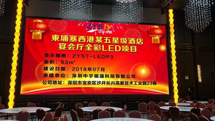 柬埔寨西港某五星級(jí)酒店與中宇視通科技合作,宴會(huì)廳63平方P3全彩LED顯示屏項(xiàng)目安裝完成,整屏點(diǎn)亮并驗(yàn)收完成。