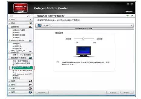右鍵點(diǎn)擊桌面空白位置,在彈出菜單中選擇“ATI控制面板”,然后在A(yíng)TI控制面板中選擇“我的數(shù)字平面面板”→“縮放選項(xiàng)(數(shù)字平面面板)”,將其設(shè)置為“過(guò)掃描0%”,則DVI信號(hào)被設(shè)置為滿(mǎn)屏輸出。