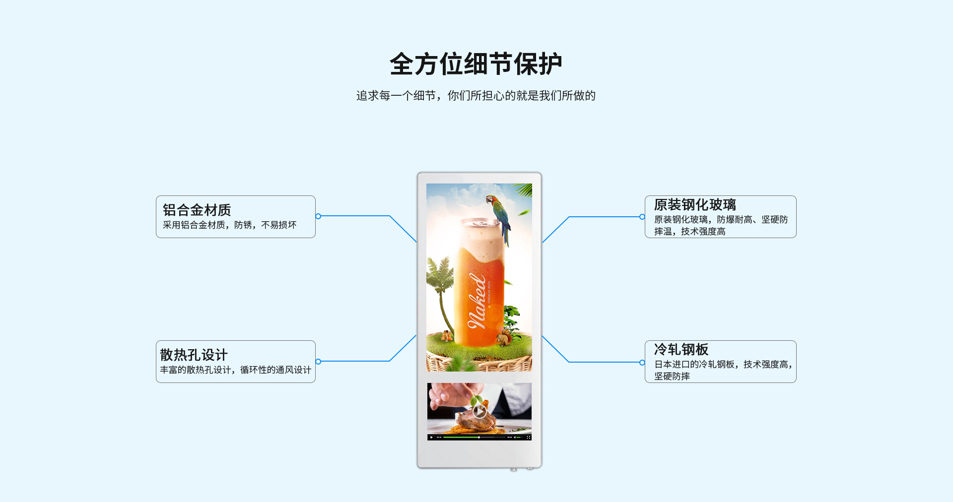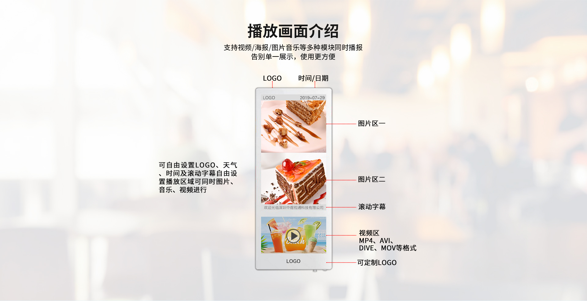 多媒體播放功能:21.5寸+12.1寸雙屏電梯廣告機可以實現(xiàn)數(shù)字化多媒體播放,可以播放音頻、視頻、圖片、文檔等一系列媒體文件。支持主流的(MP3,APE,F(xiàn)LAC,AAC,OGG)等音頻格式。同時支持多種格式(MKV,MPEG4,AVI,F(xiàn)LV,MOV,RMVB,WMA)視頻播放,還支持各種圖片文檔類(JPEG, BMP, PNG,GIF )的廣告播放功能。