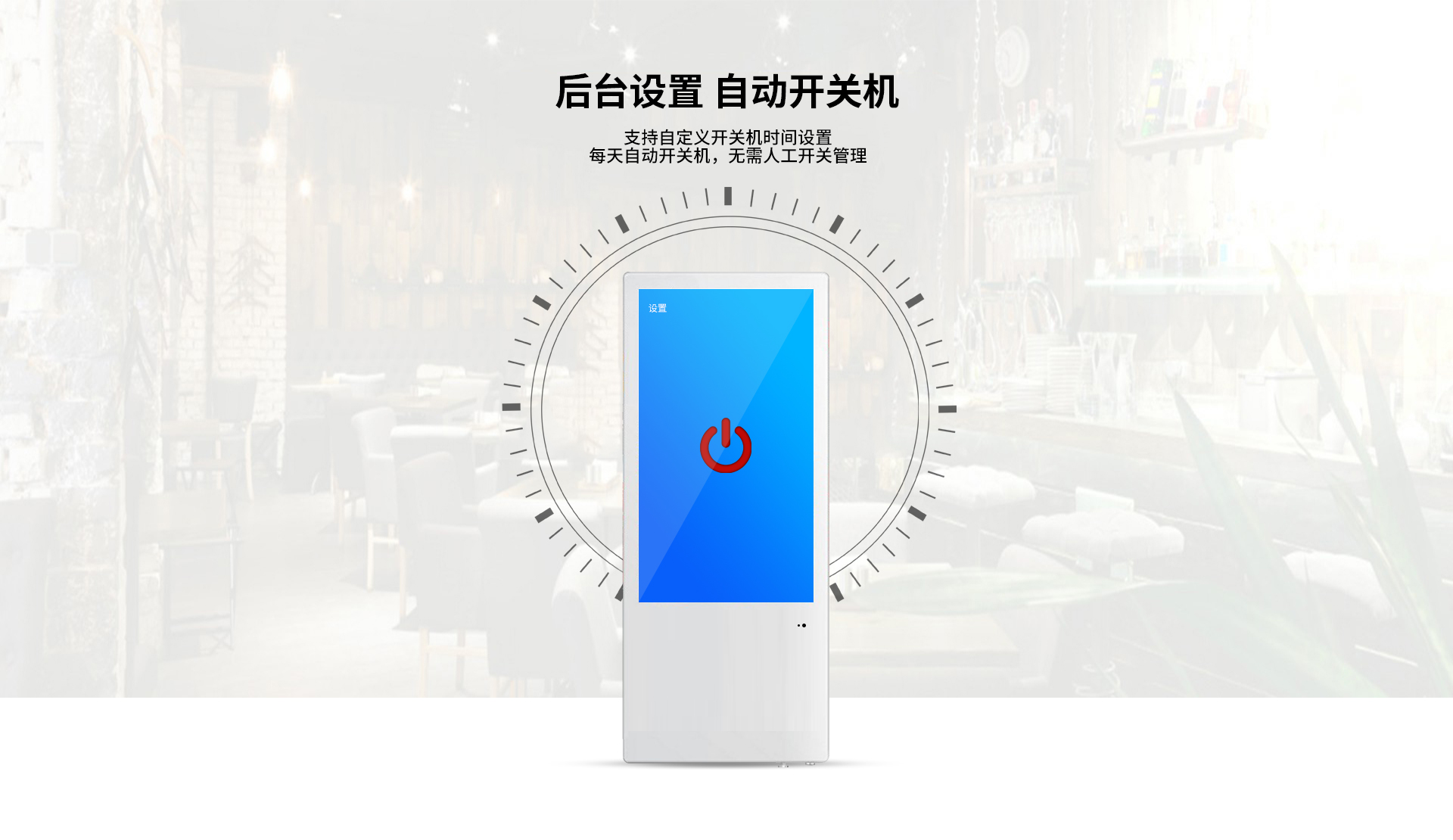 應急照明:當外部電源停電時,電梯廣告機內置應急照明系統(tǒng)將啟用備用電源,打開應急照明燈,終端停止播放節(jié)目,備用電源可供應急照明燈使用,當外部電源恢復時,系統(tǒng)自動切換為外部電源供電,并對電池充電。
